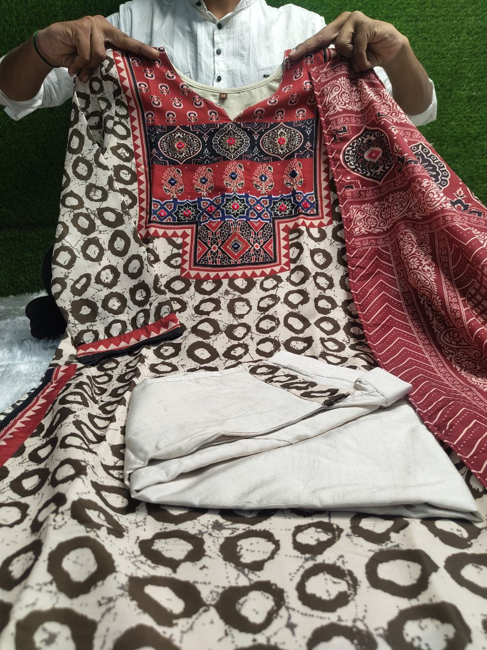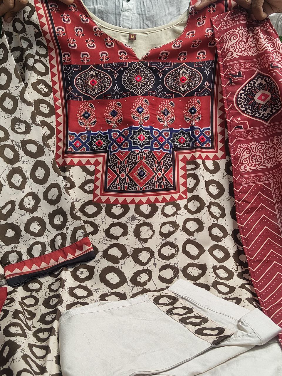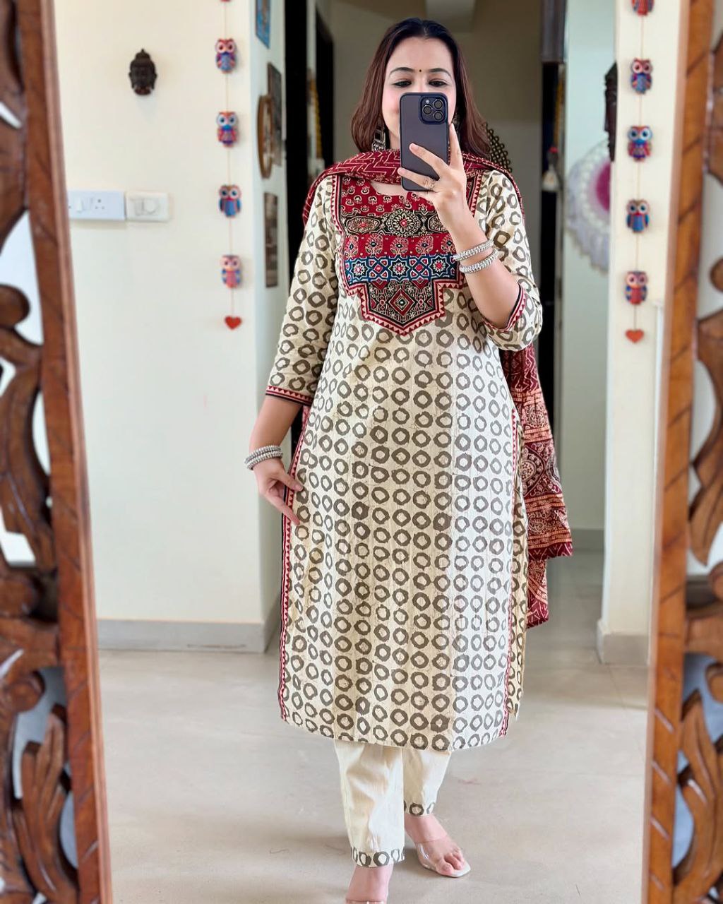 Elevate your ethnic wardrobe with this elegant beige kurti set featuring intricate Ajrakh embroidery on the yoke and sleeves. Paired with matching straight pants and a rich red dupatta, it offers timeless grace for festive and casual wear alike
