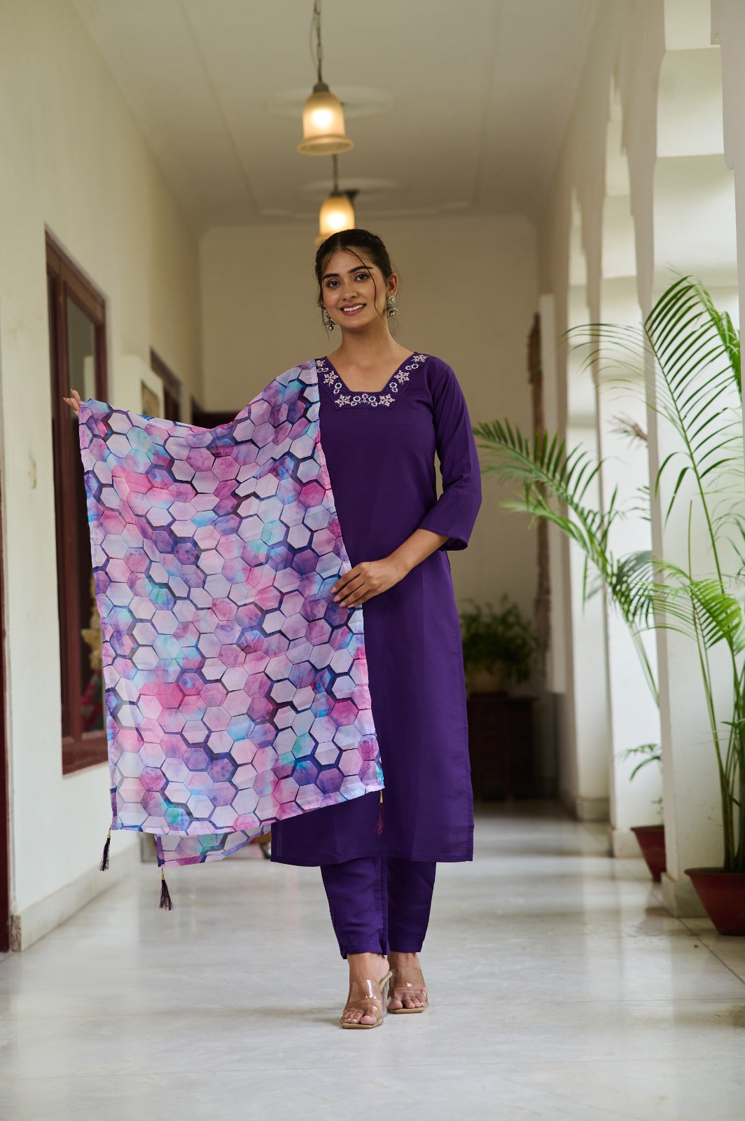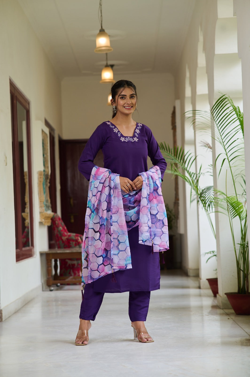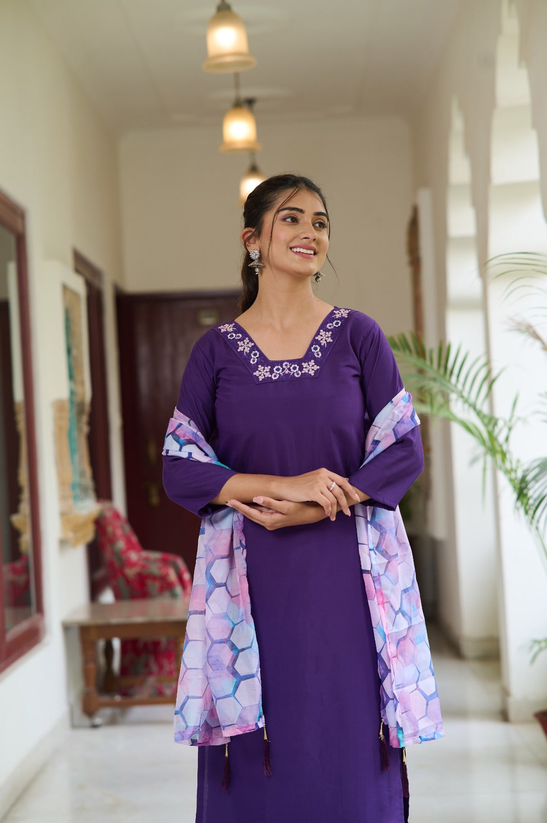 Embrace elegance with this deep purple Kurti set, featuring delicate embroidery on the neckline and a vibrant printed dupatta