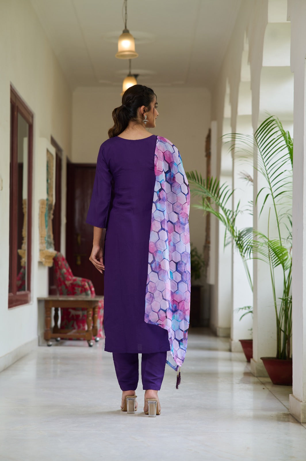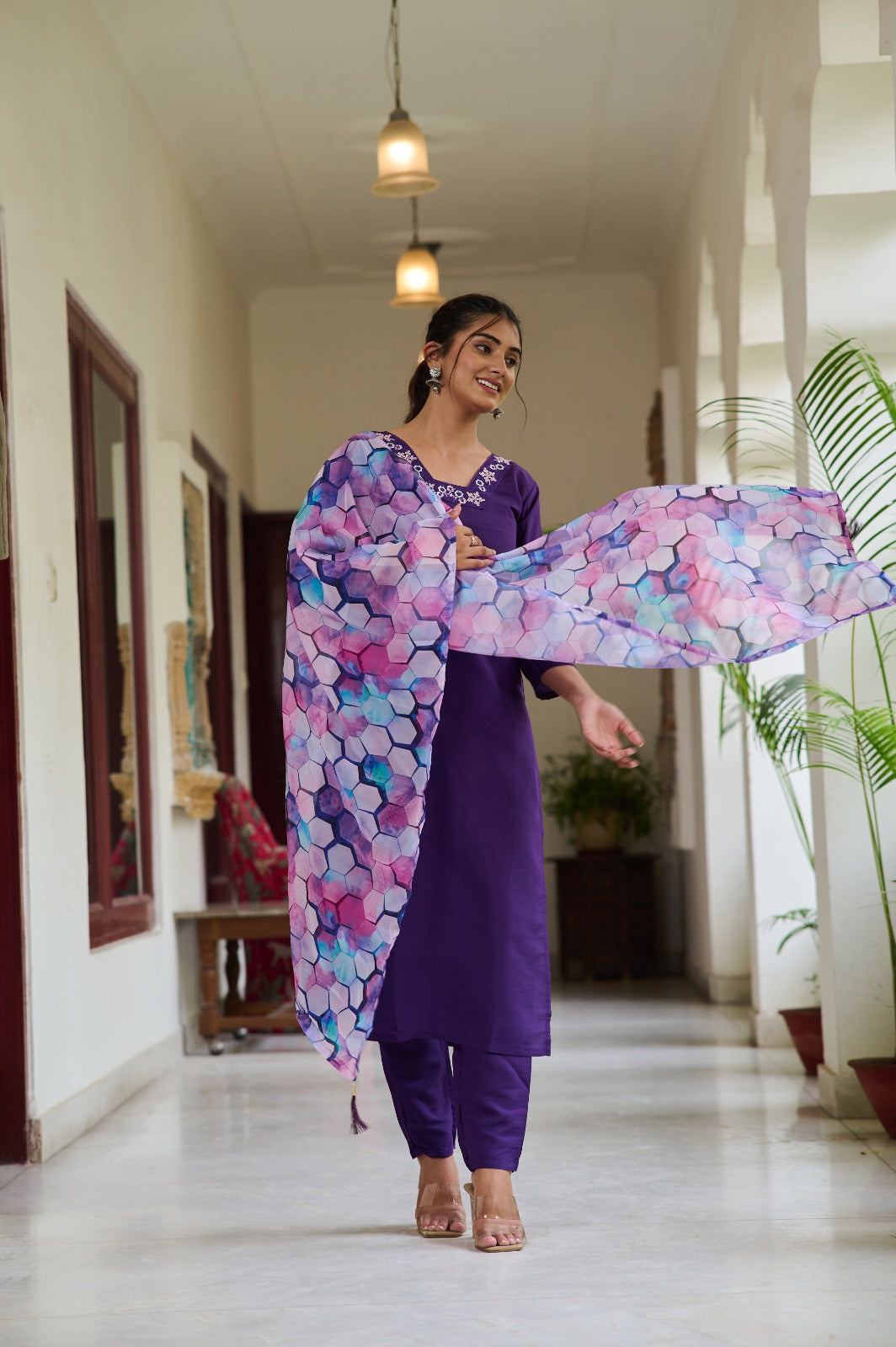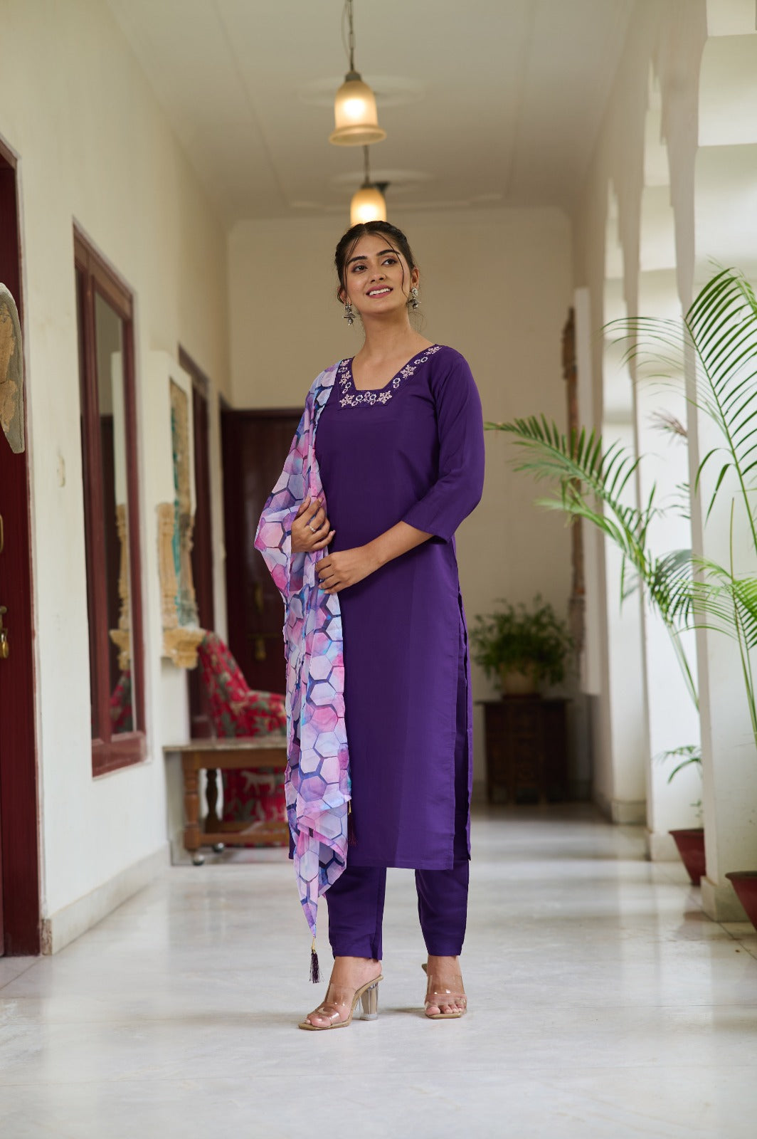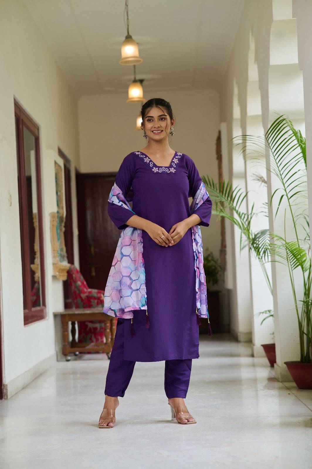 Embrace elegance with this deep purple Kurti set, featuring delicate embroidery on the neckline and a vibrant printed dupatta