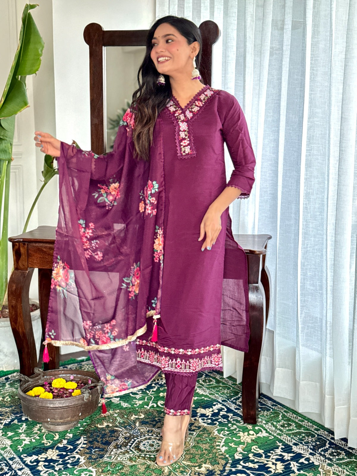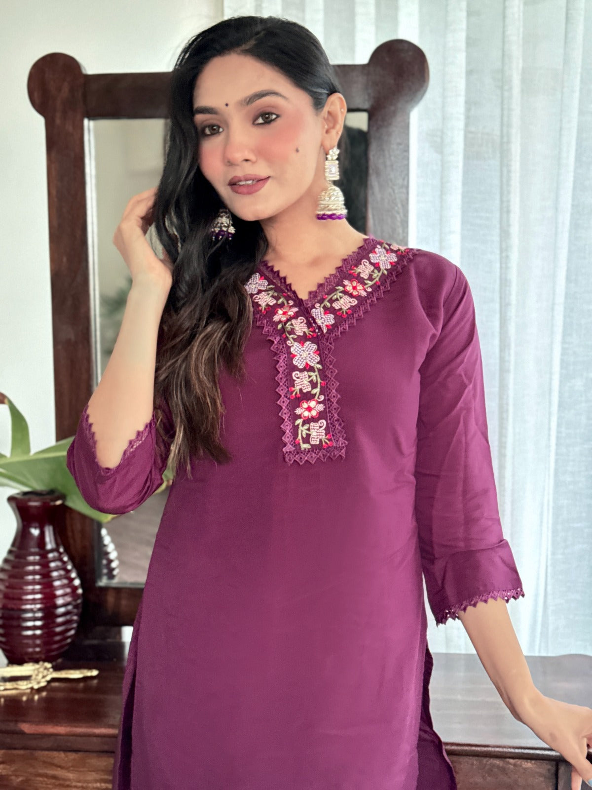 Embrace elegance with this rich plum kurti set, featuring intricate lace detailing and vibrant floral prints