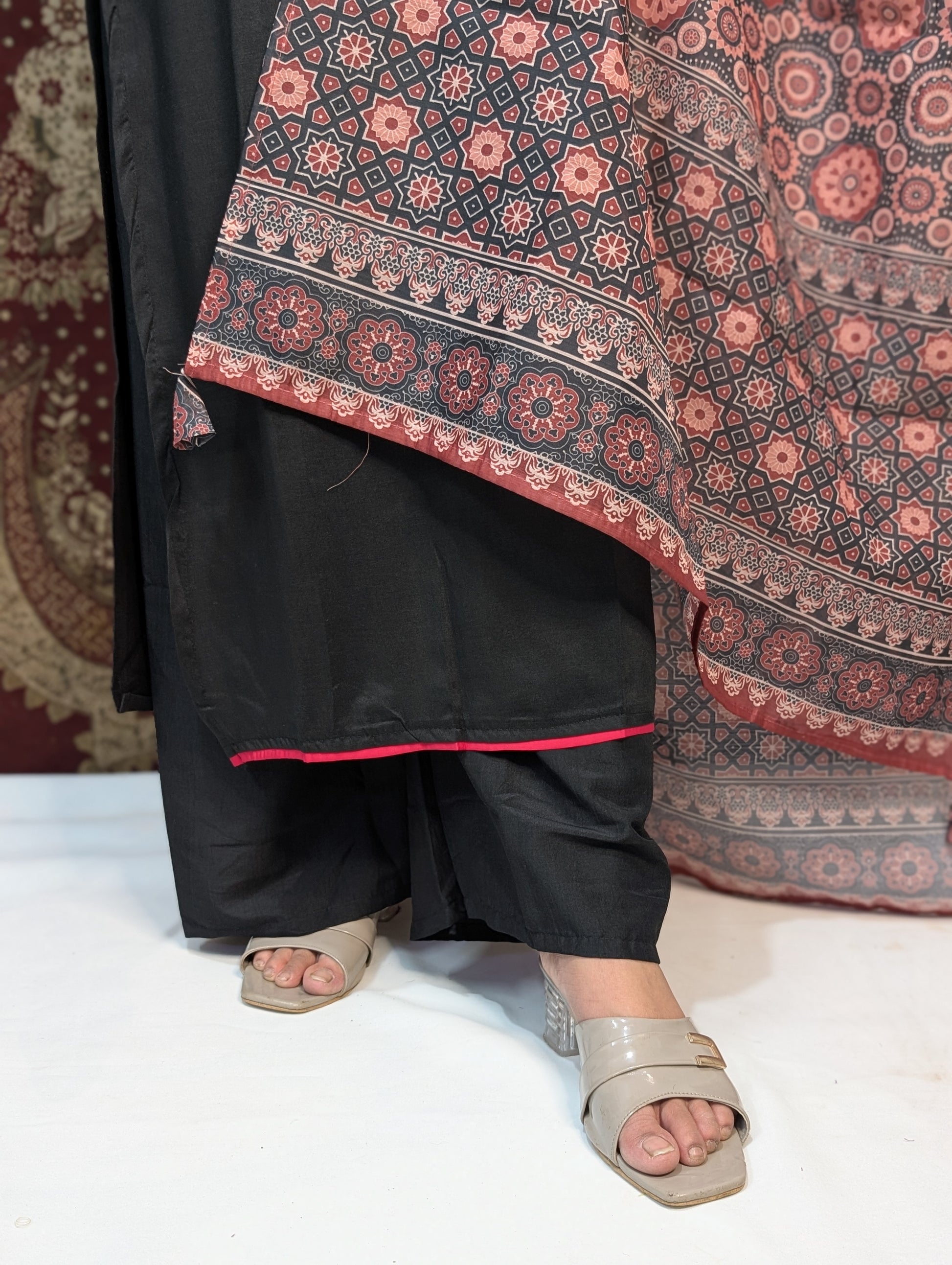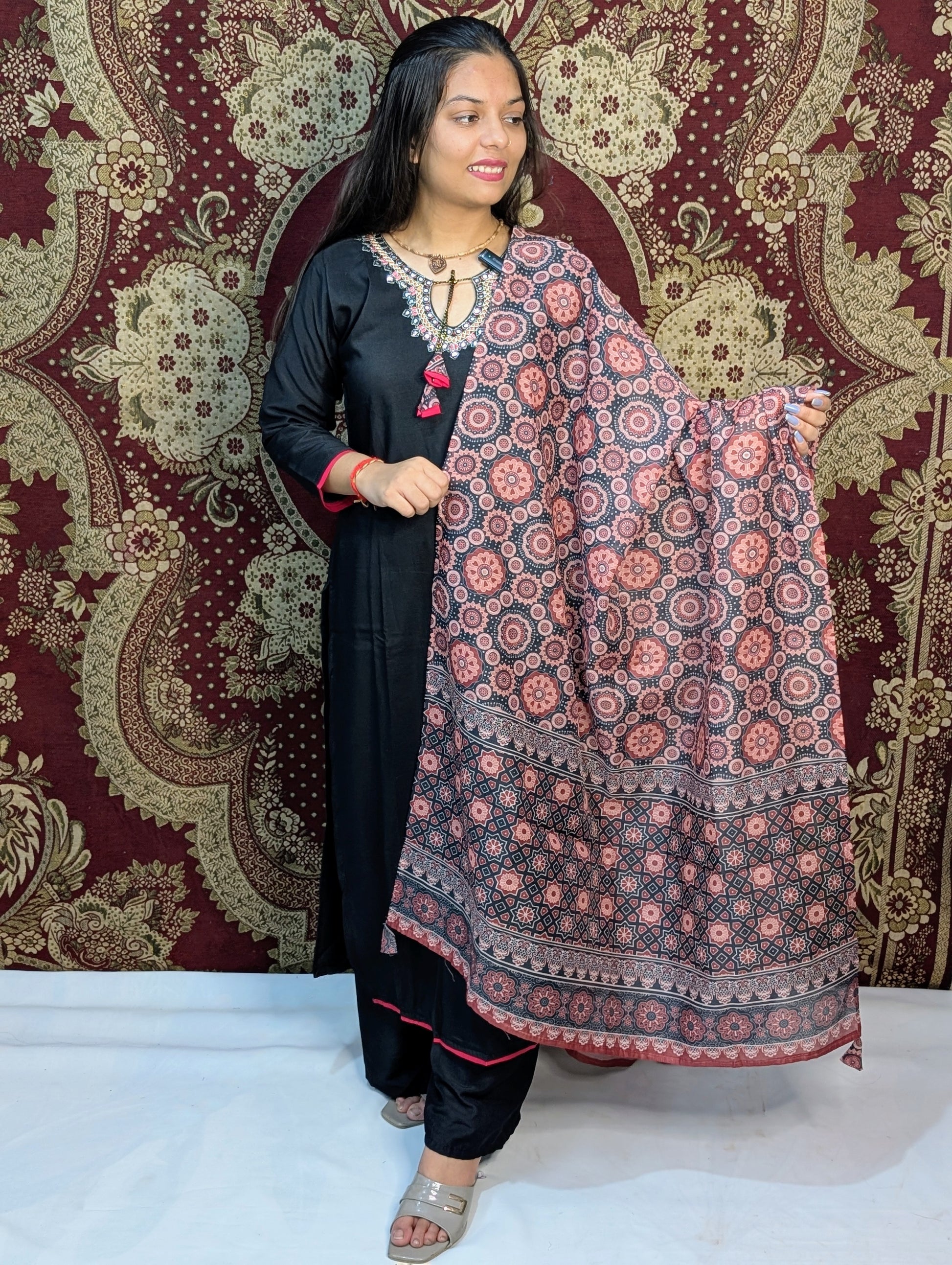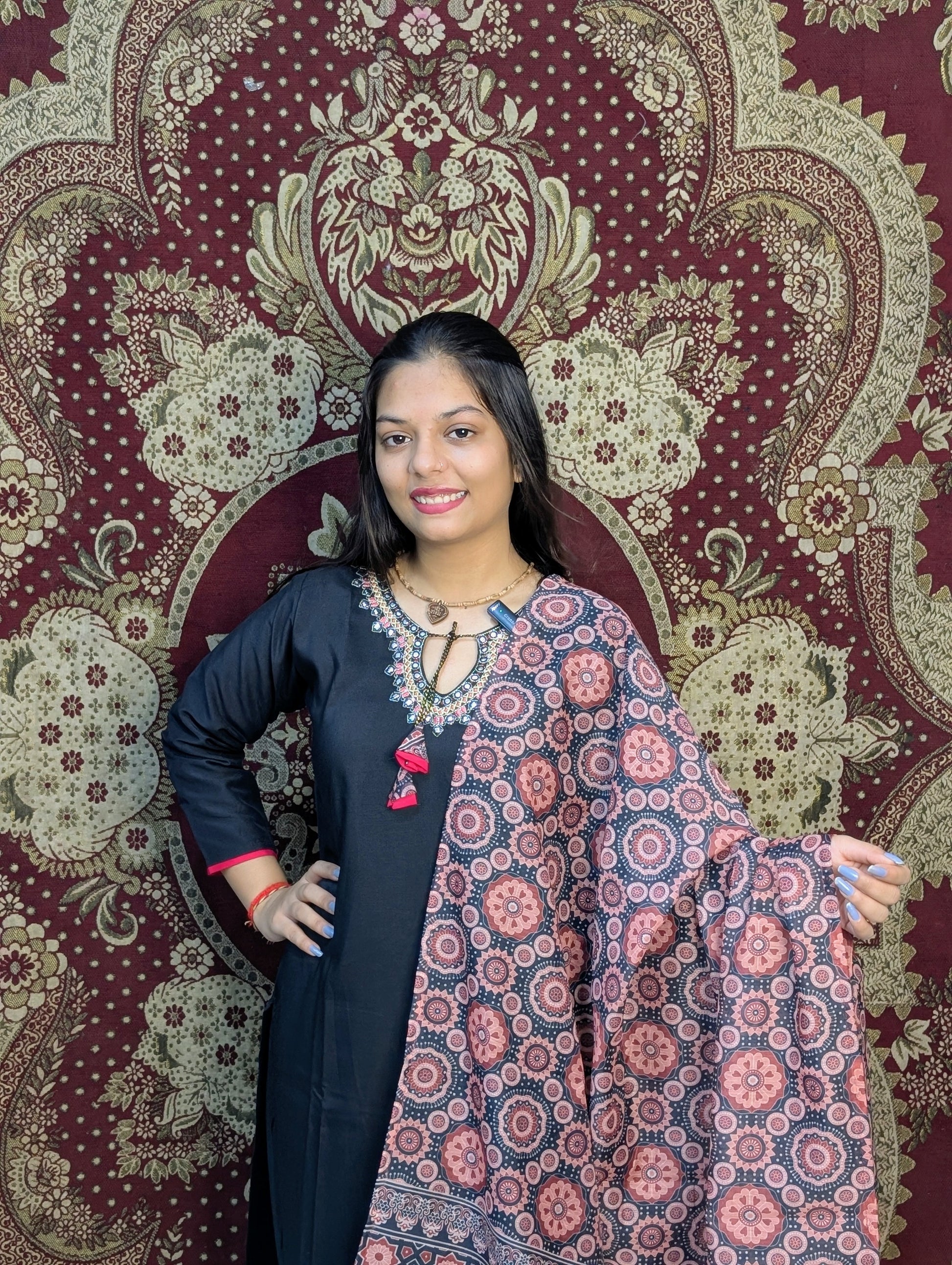 Exude elegance in this black kurti set, highlighted by intricate embroidery around the neckline and a beautifully printed dupatta in earthy tones. A perfect pick for graceful gatherings, this ensemble brings together simplicity and sophistication.