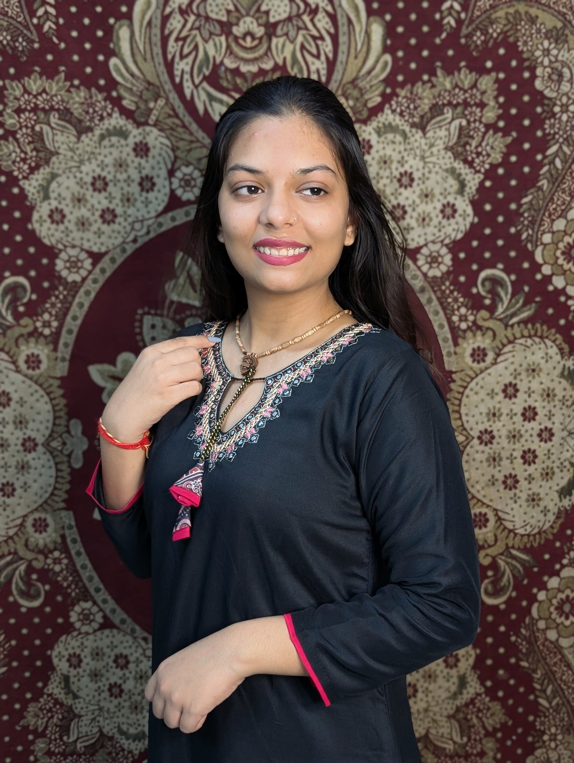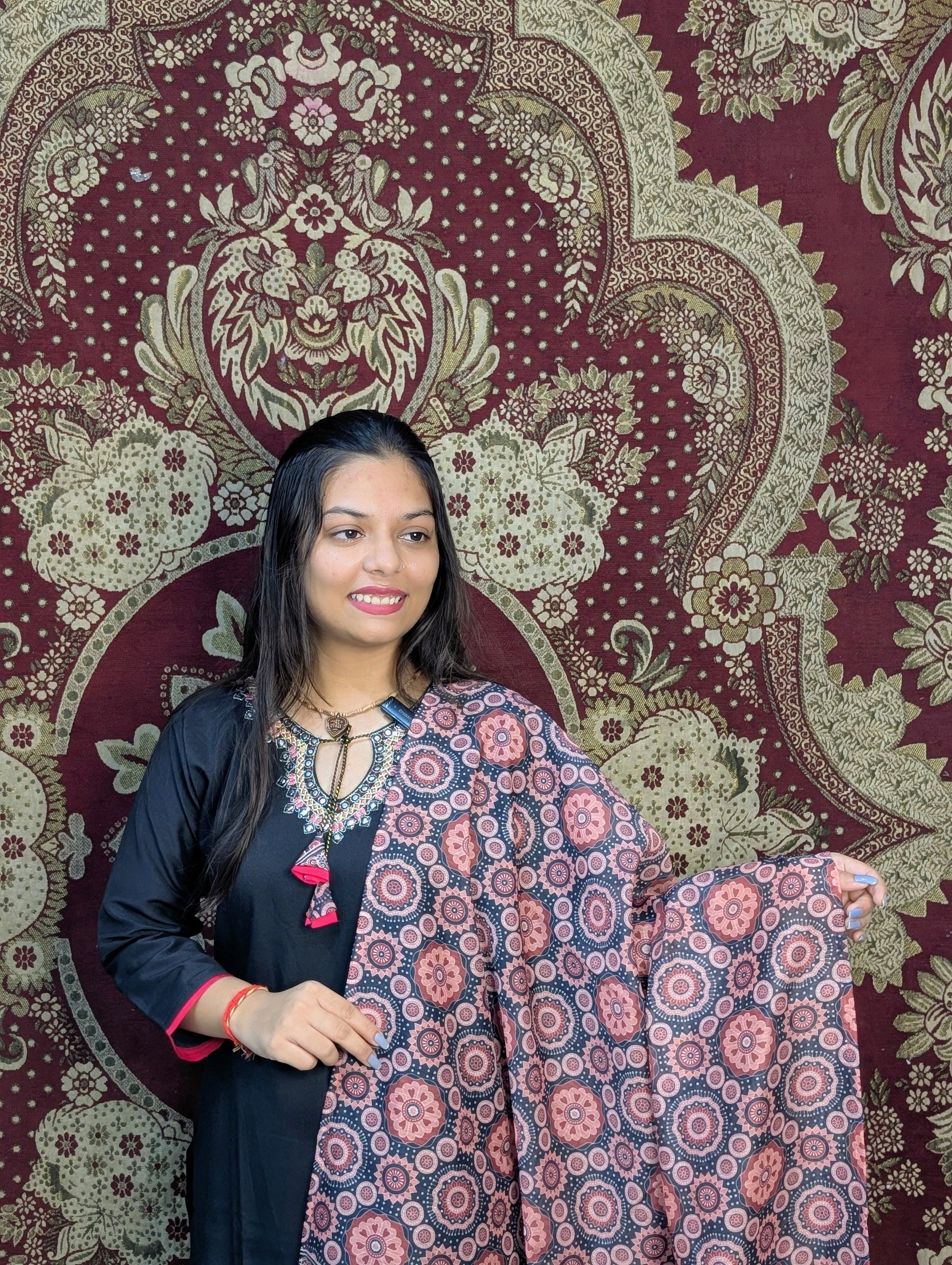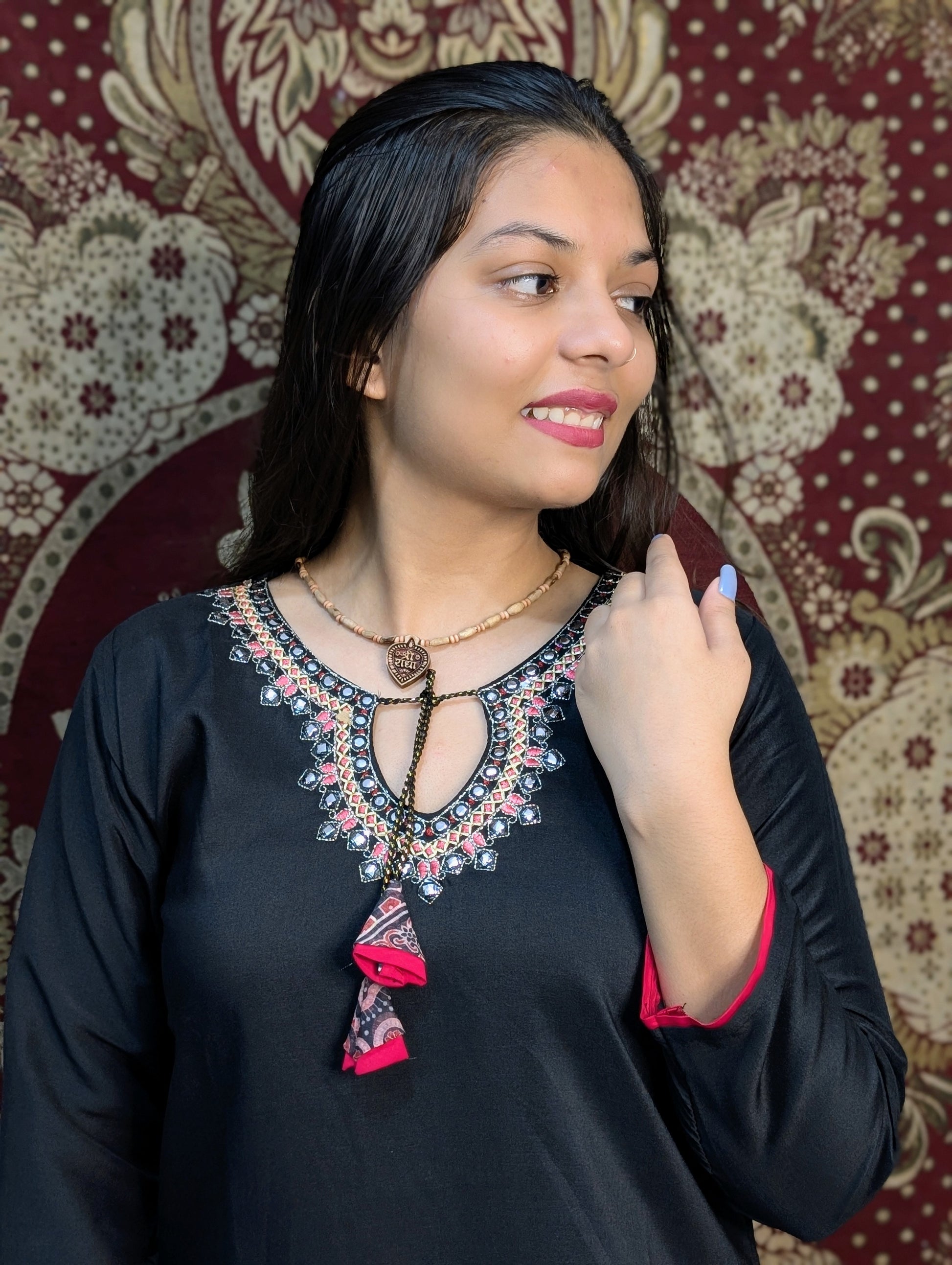 Exude elegance in this black kurti set, highlighted by intricate embroidery around the neckline and a beautifully printed dupatta in earthy tones. A perfect pick for graceful gatherings, this ensemble brings together simplicity and sophistication.