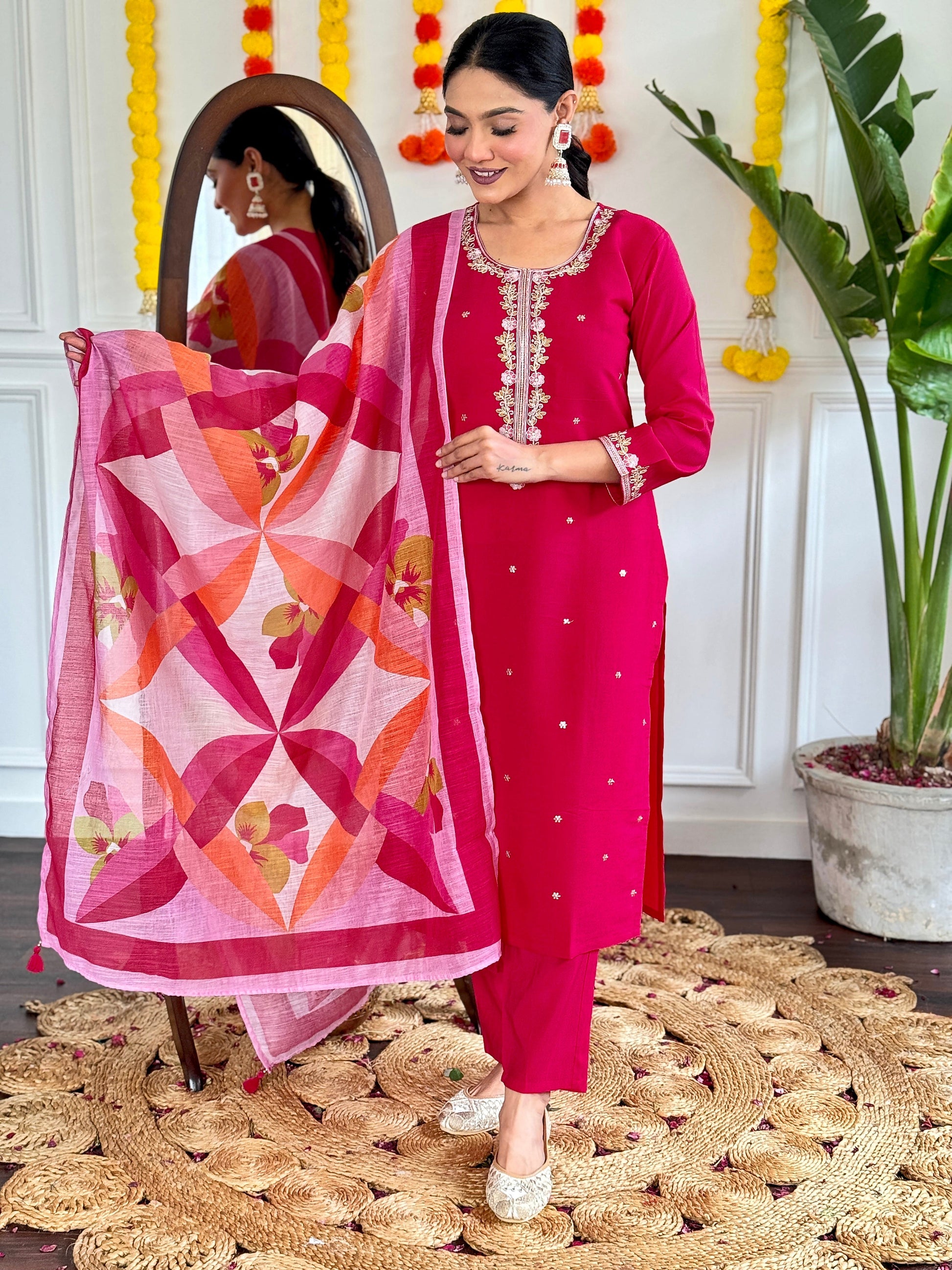 Radiate elegance with this stunning pink kurti set, adorned with delicate embroidery and paired with a vibrant printed dupatta