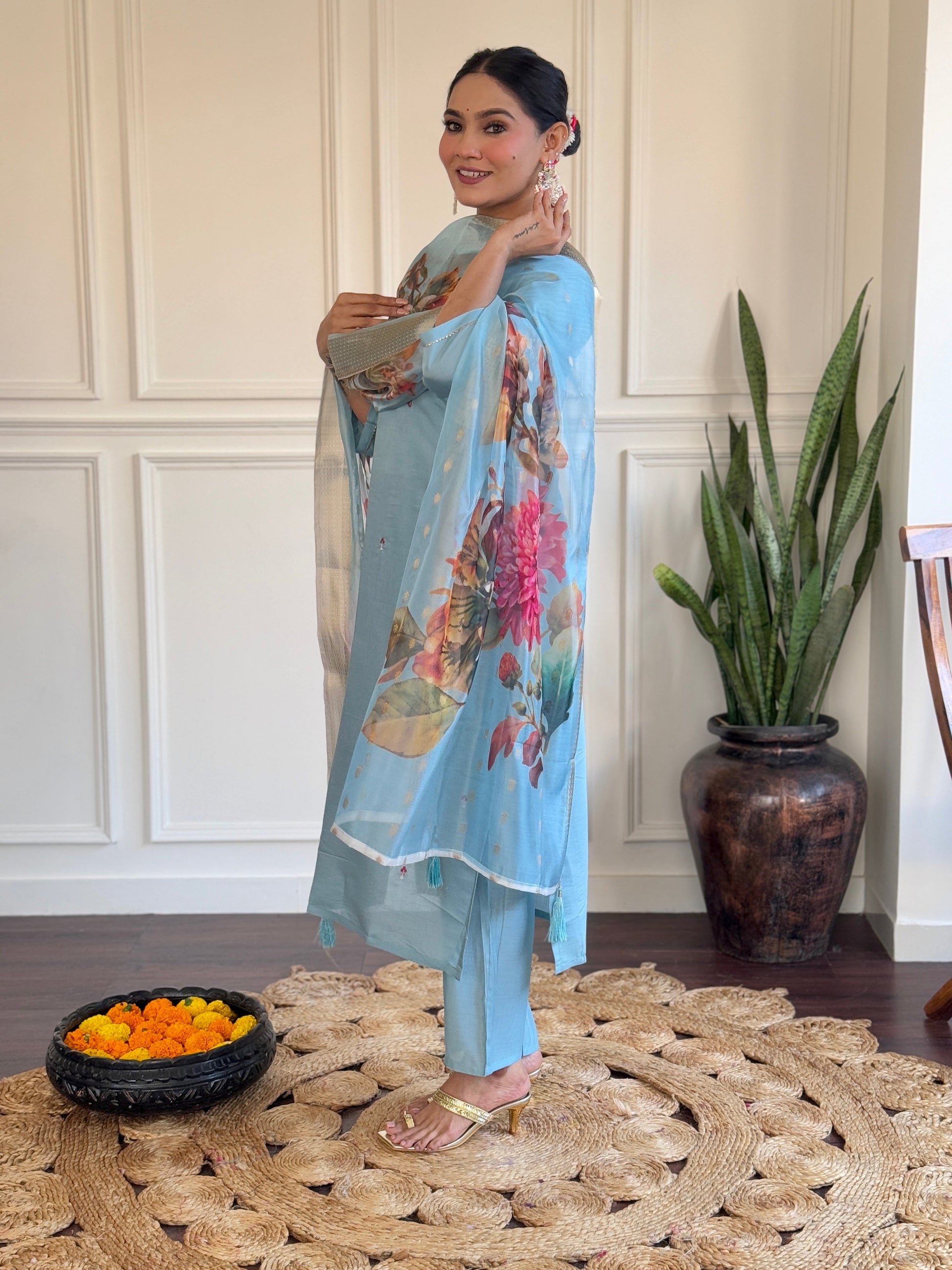 Step into elegance with this pastel blue Kurti set, featuring delicate embroidery and a beautifully printed dupatta