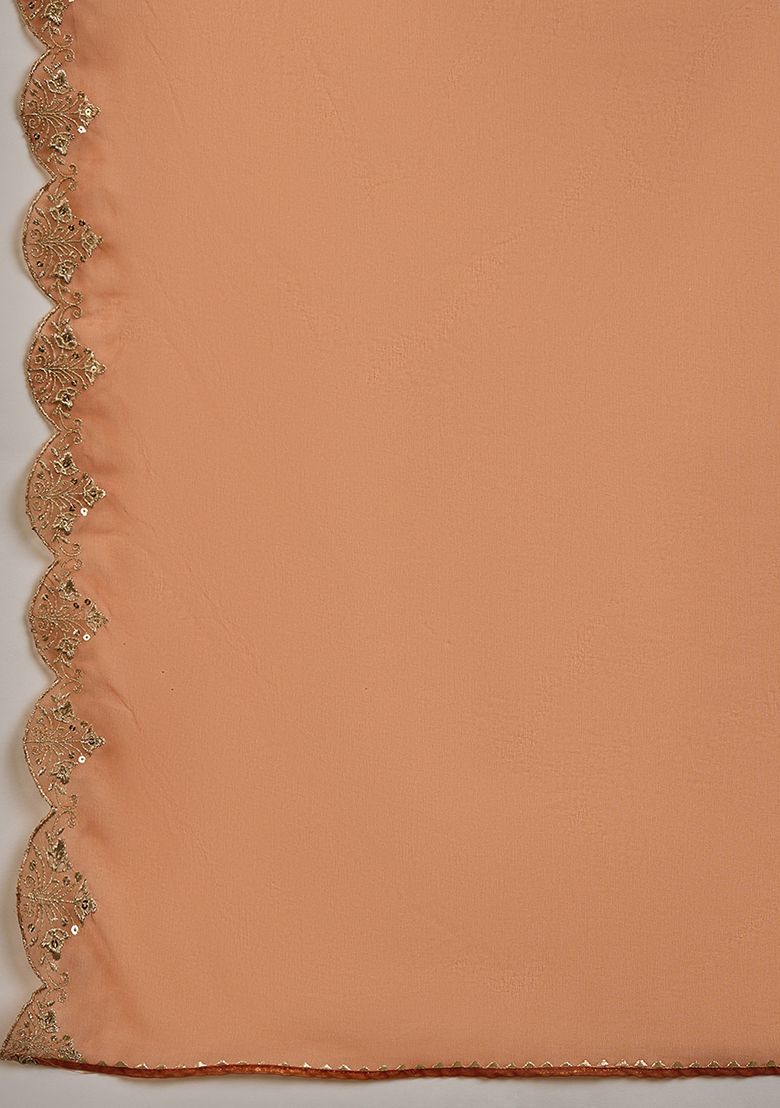 Radiate elegance in this rust-orange kurti set, adorned with intricate embroidery and a sheer embellished dupatta