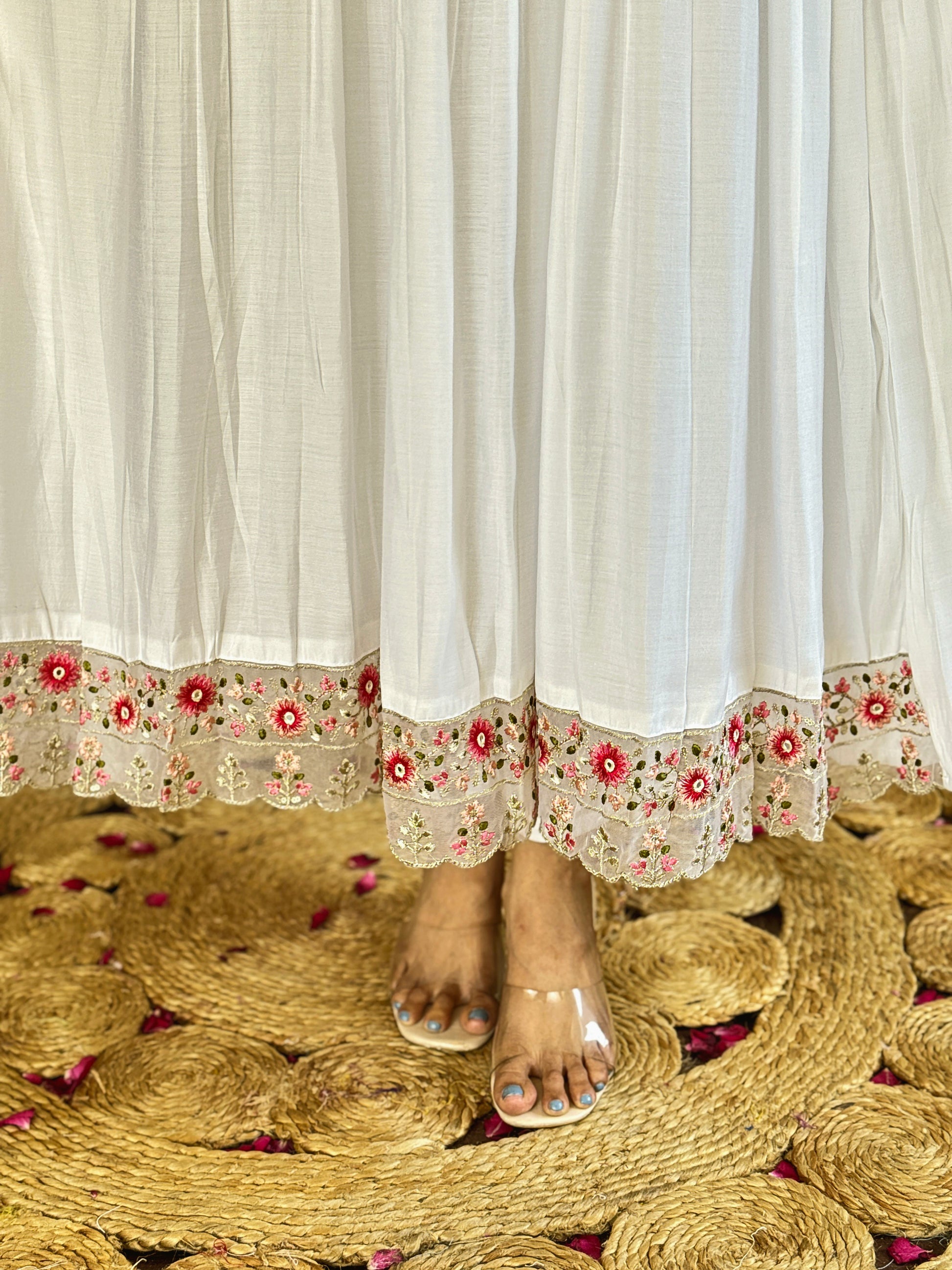 Grace meets elegance in this ethereal white Anarkali set, adorned with delicate floral embroidery and a stunning pink ombre dupatta
