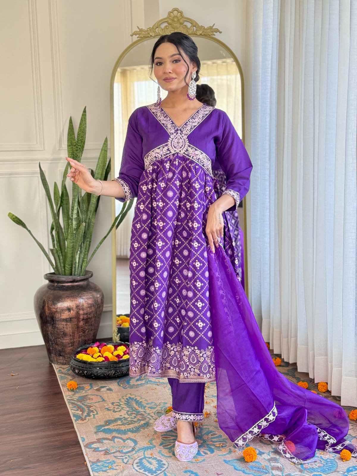 Elevate your style with this regal purple kurti set, adorned with intricate embroidery and traditional motifs