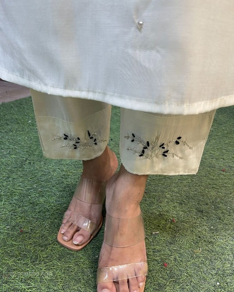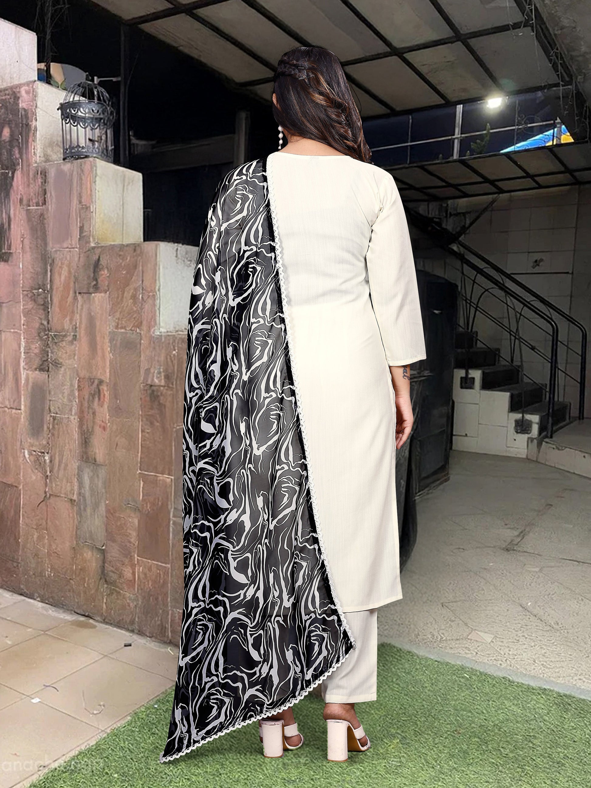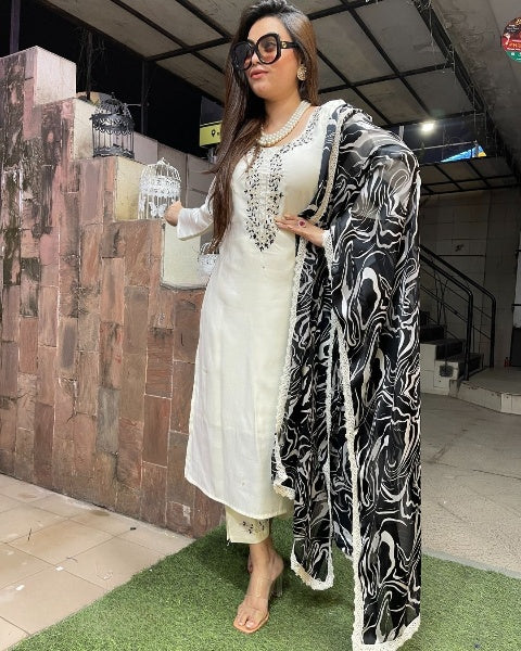 Make a bold statement with this stunning white kurti set, elegantly adorned with intricate embellishments