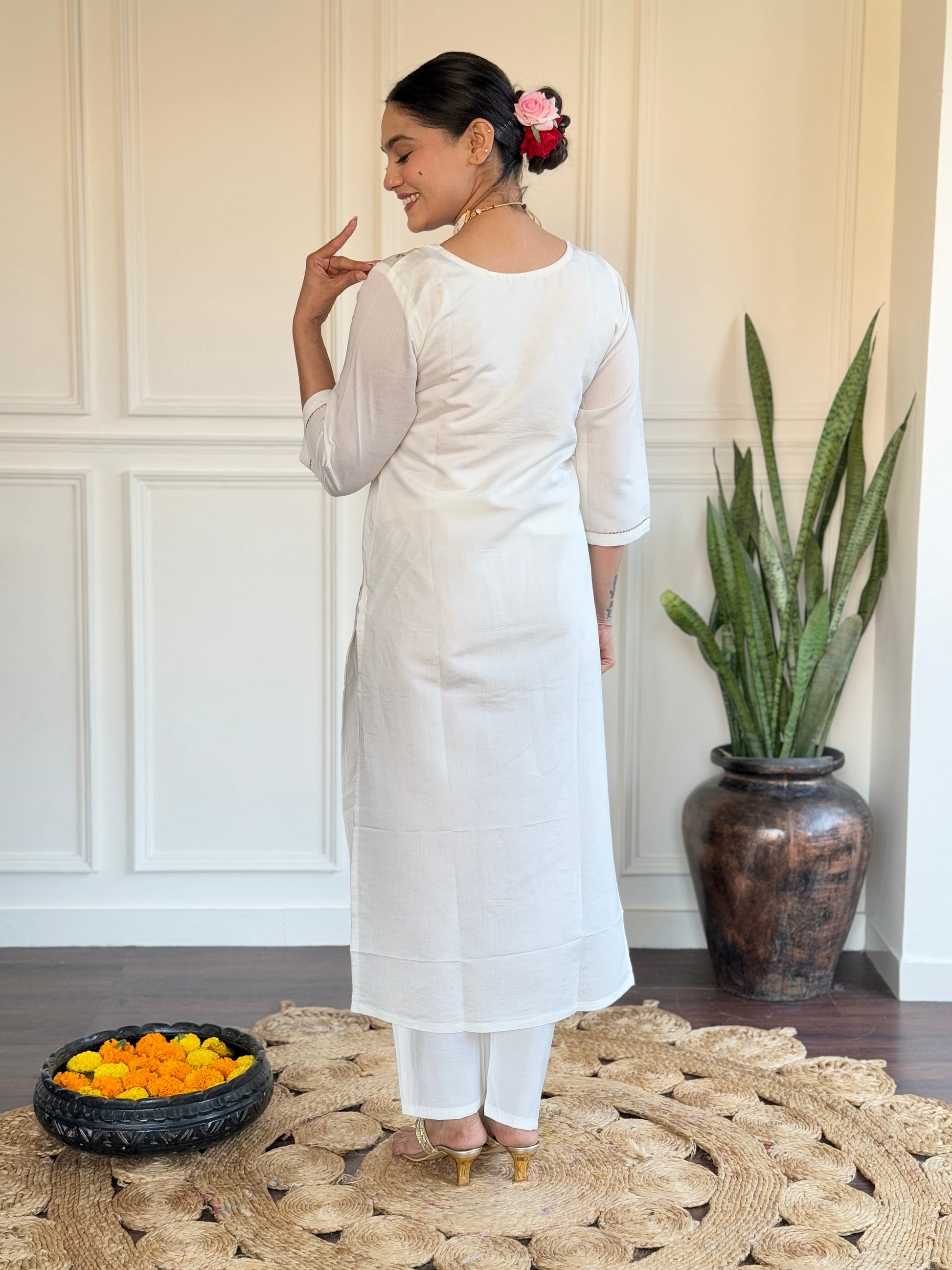 Embrace elegance with this serene white kurti set, adorned with delicate pastel embroidery and a floral-printed blue dupatta