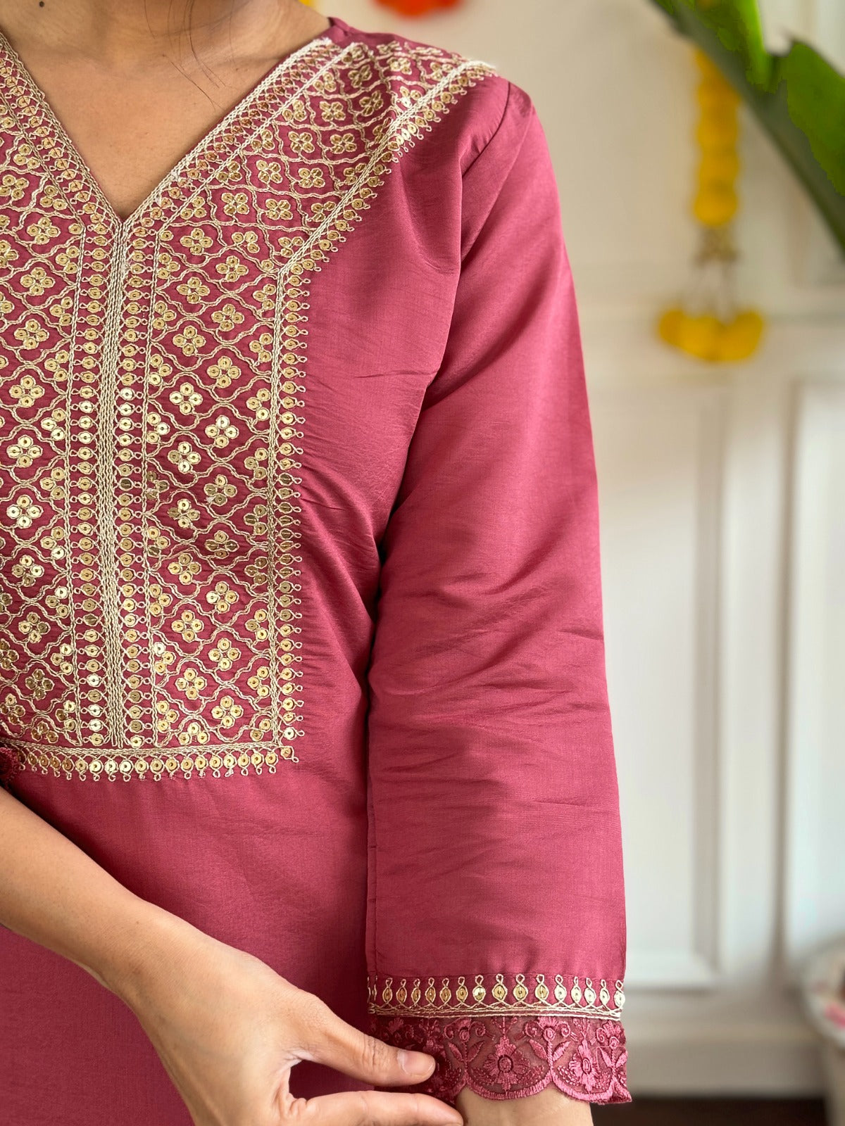Elevate your ethnic style with this gorgeous rose-pink kurti set, featuring intricate embroidery and a delicate sheer dupatta