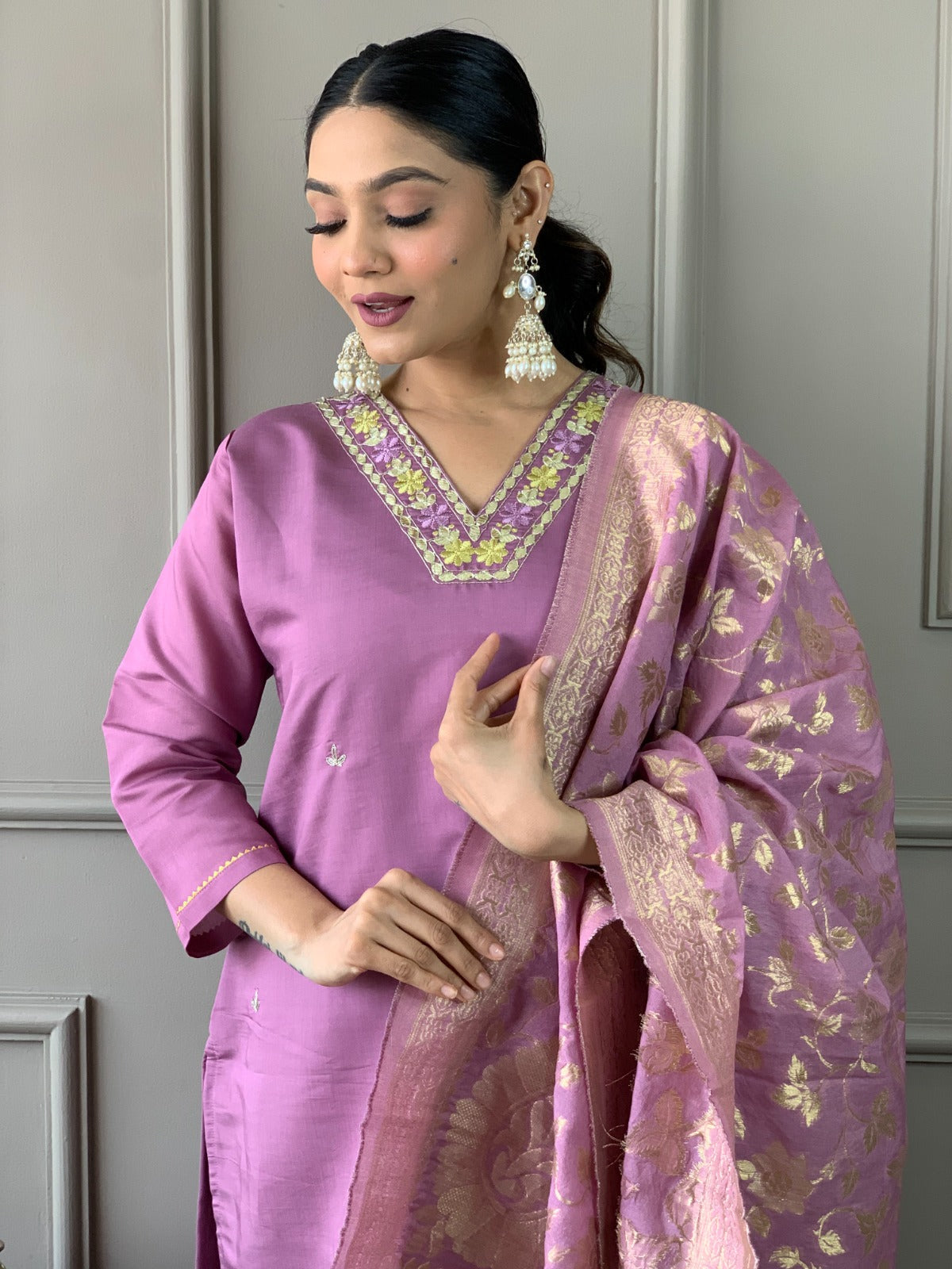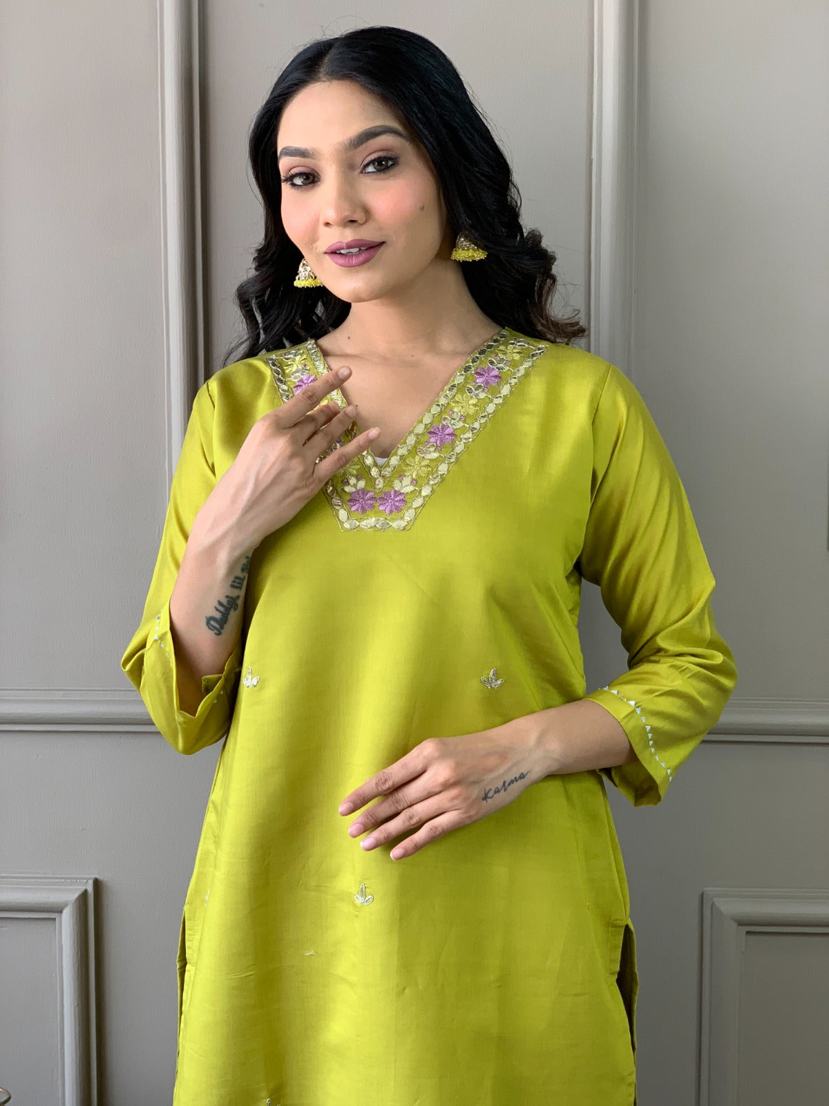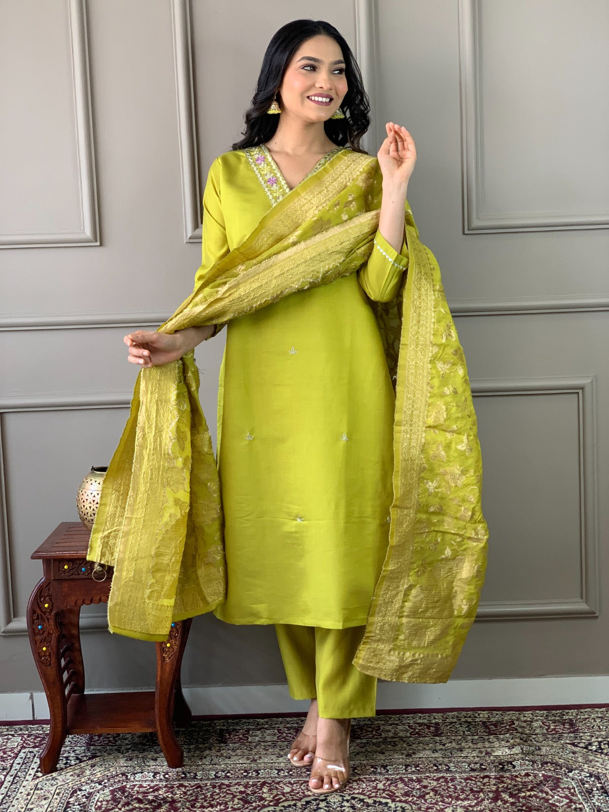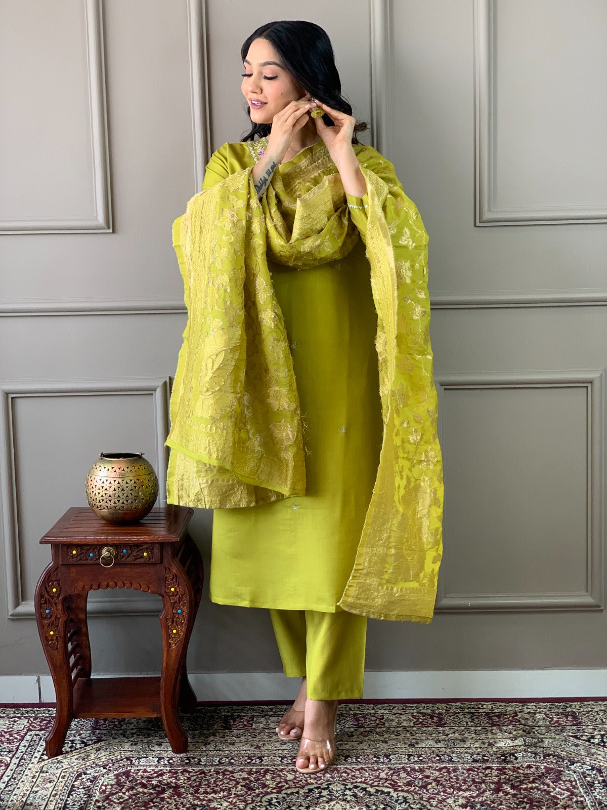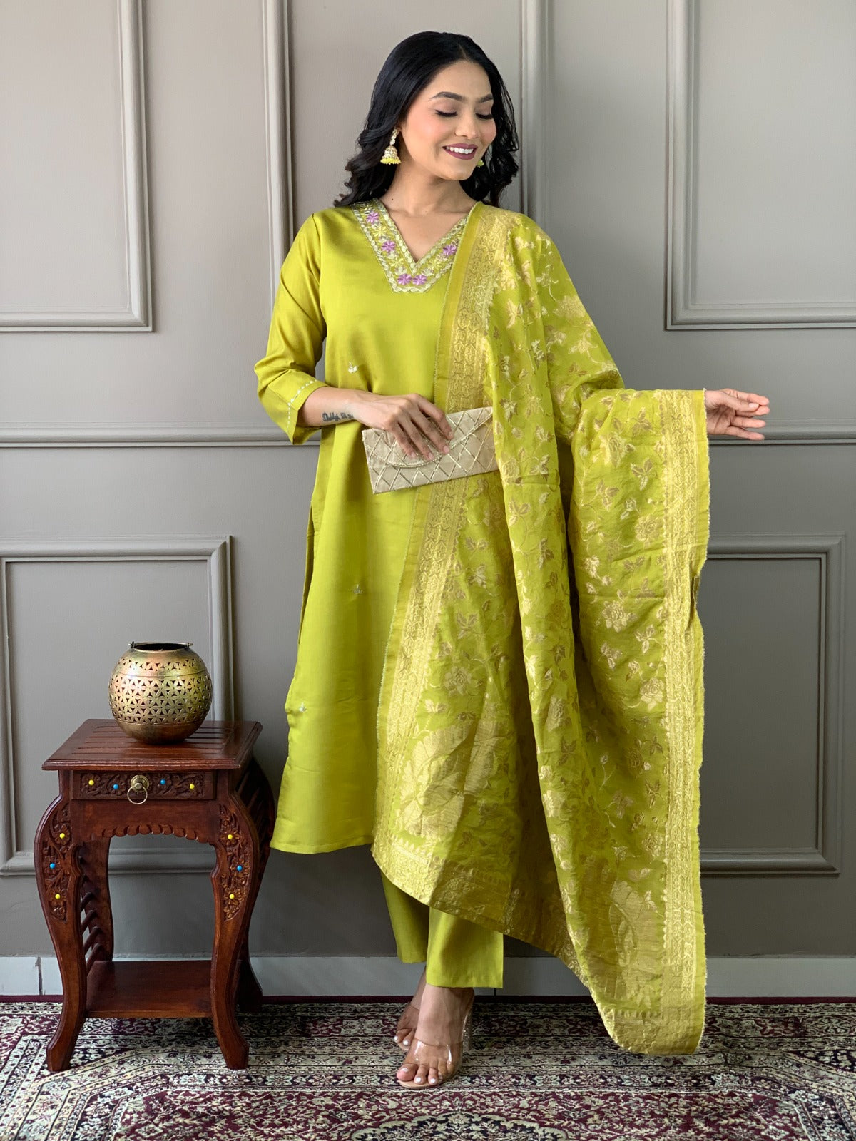 Embrace sophistication with this lime-green kurti set, featuring delicate floral embroidery and a luxurious Banarasi dupatta