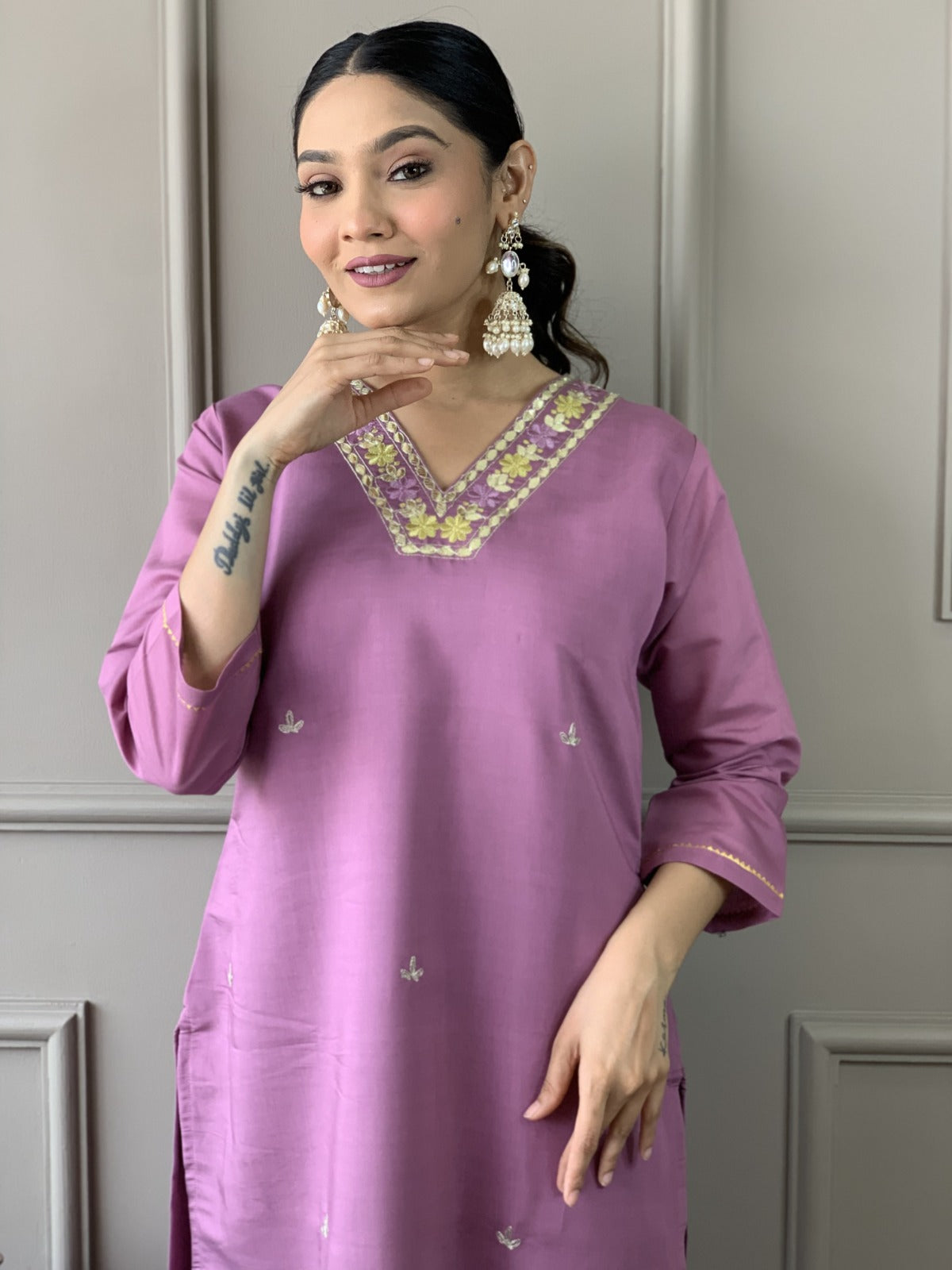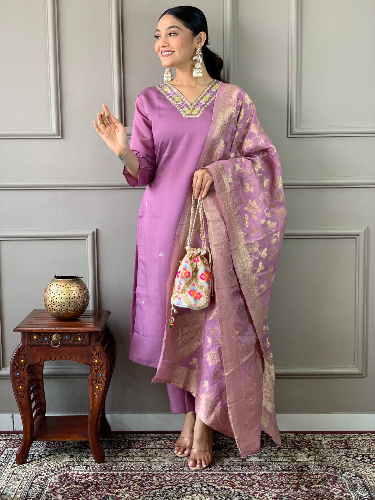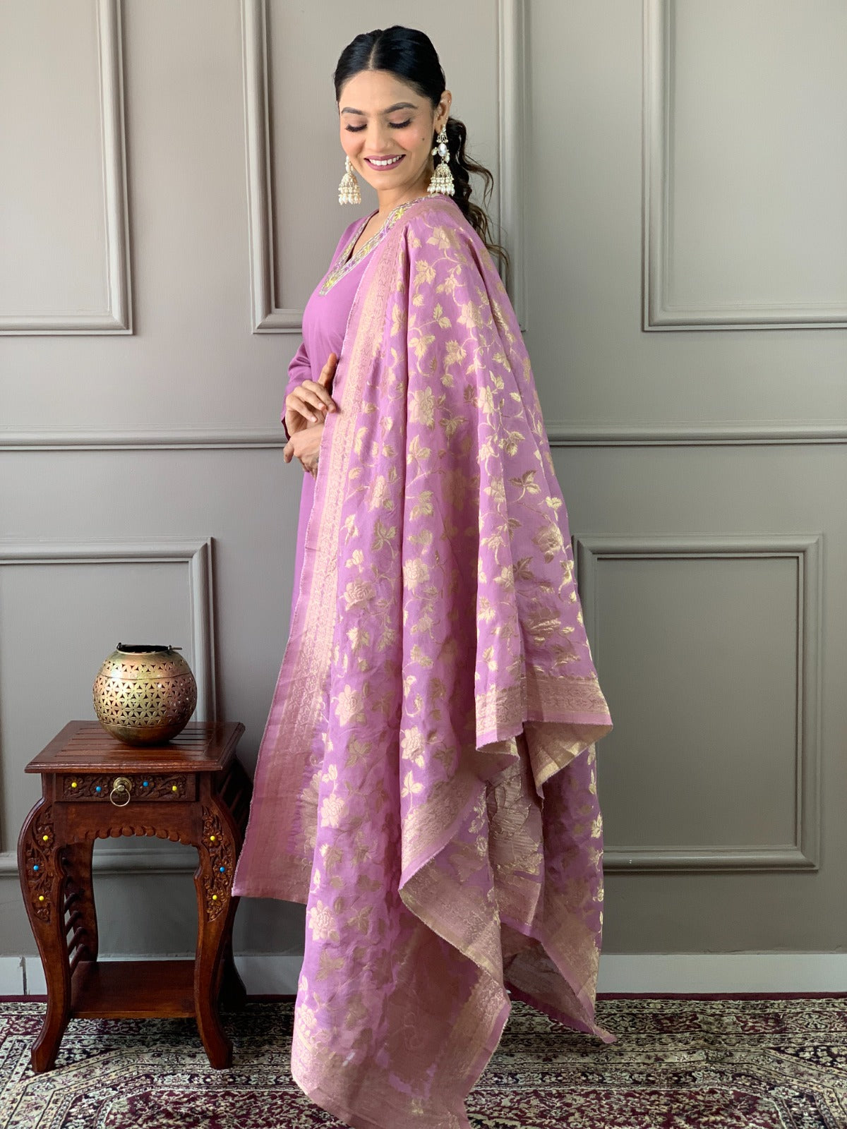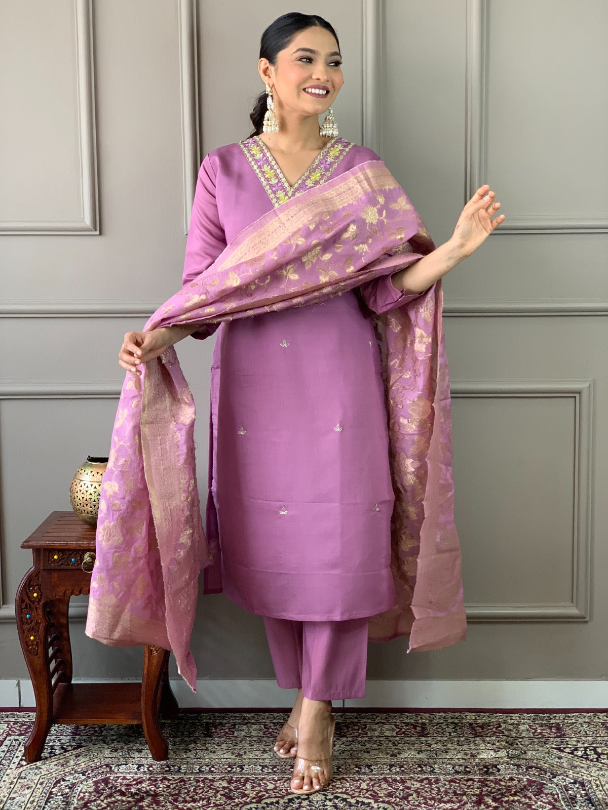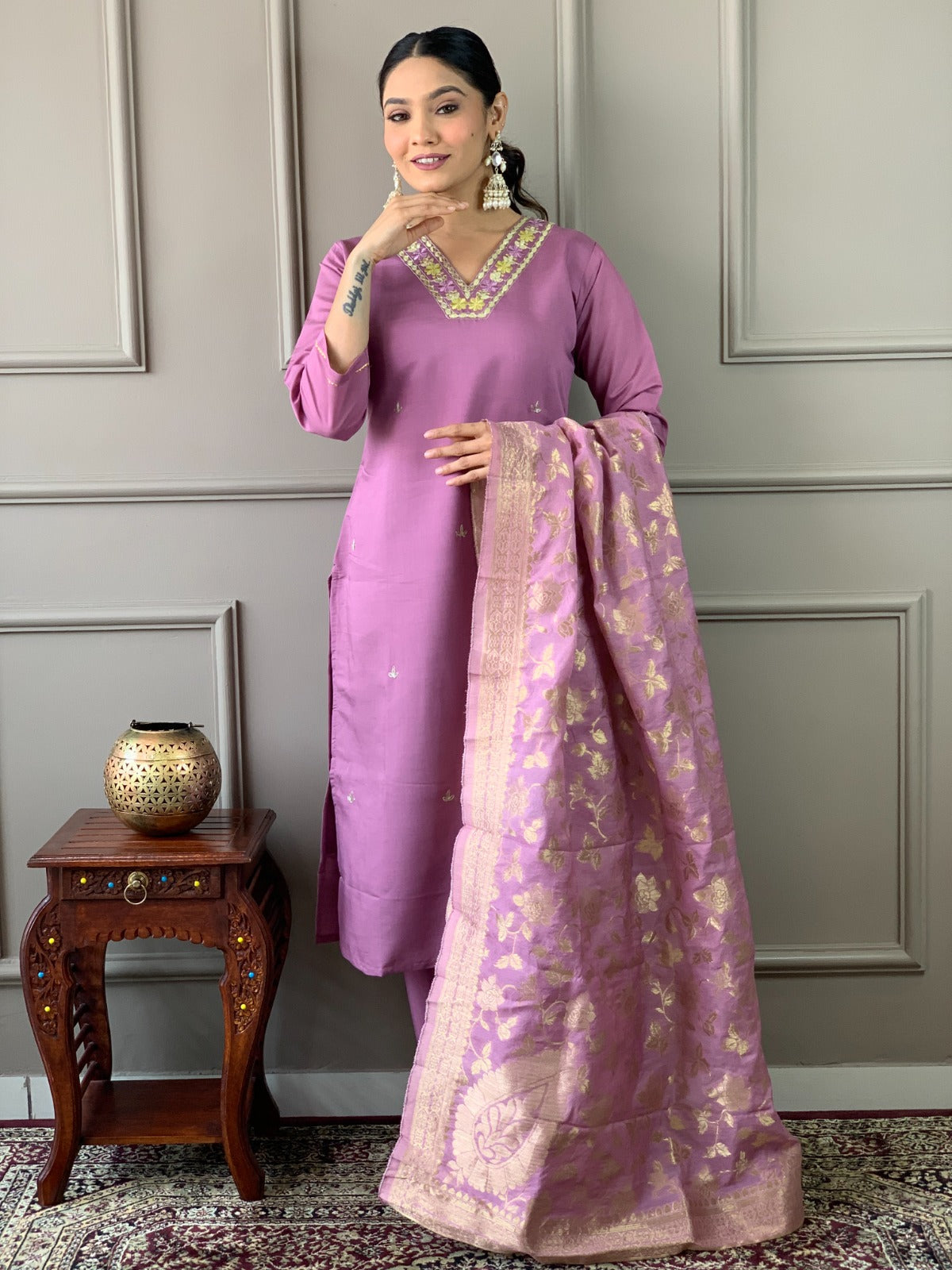 Embrace sophistication with this lime-green kurti set, featuring delicate floral embroidery and a luxurious Banarasi dupatta