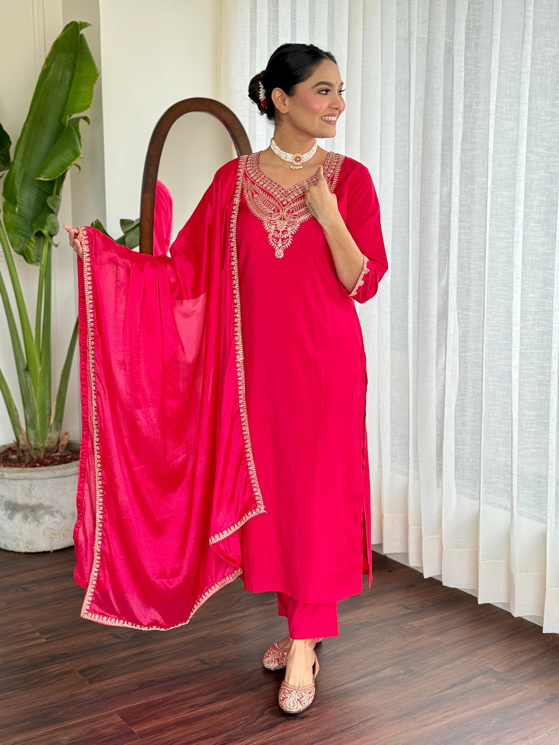 Make a bold statement with this stunning red kurti set, featuring intricate gold embroidery and a luxurious silk dupatta