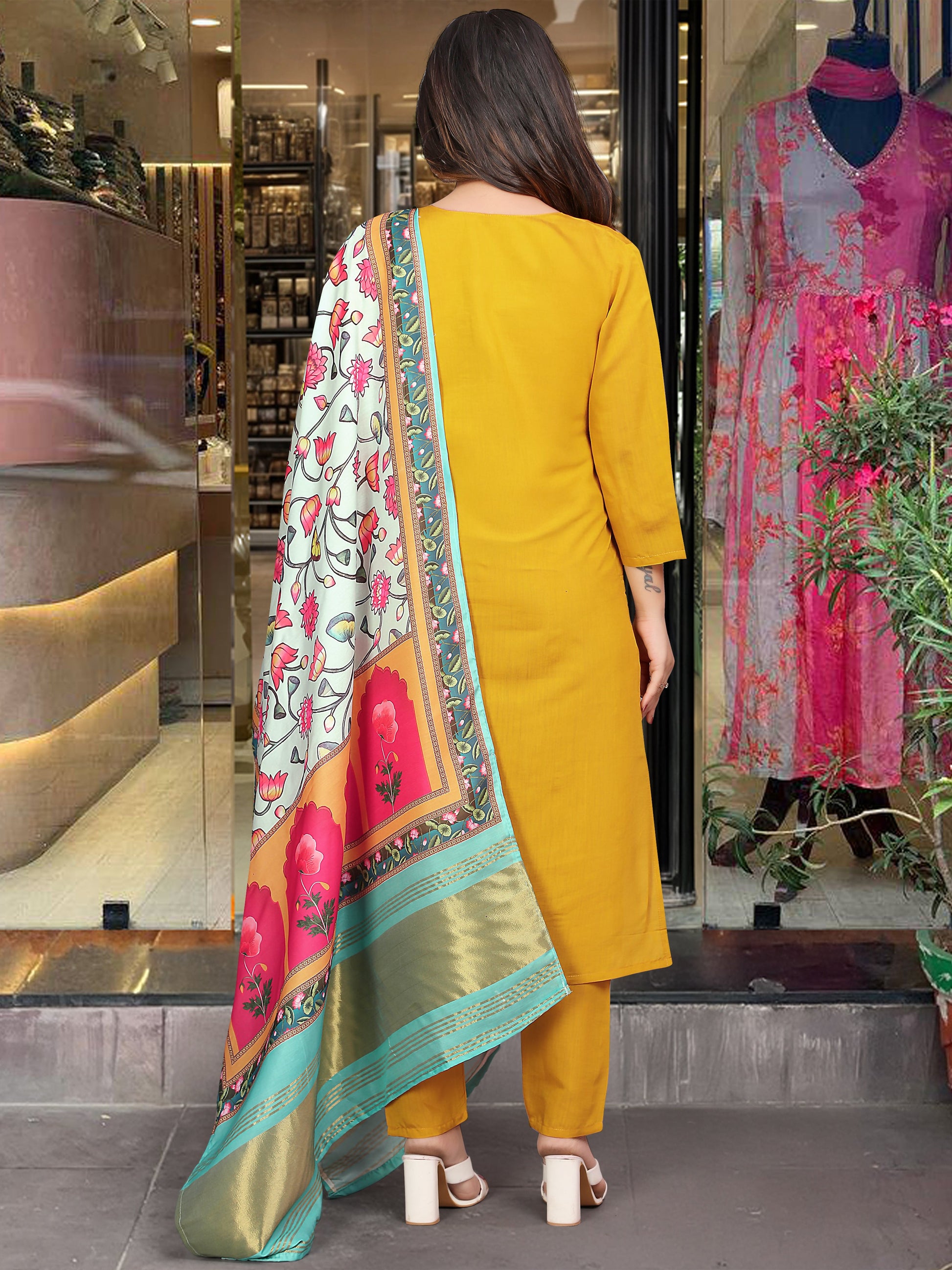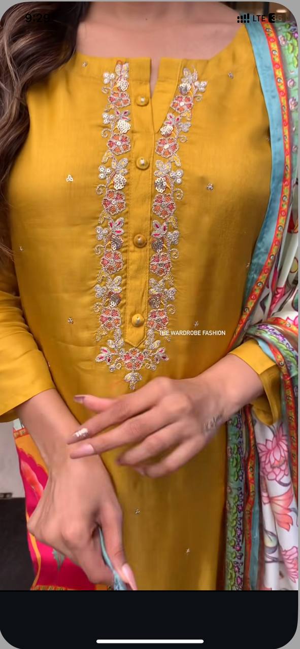 Brighten up your wardrobe with this mustard yellow kurti set, featuring delicate embroidery and a vibrant multicolored dupatta